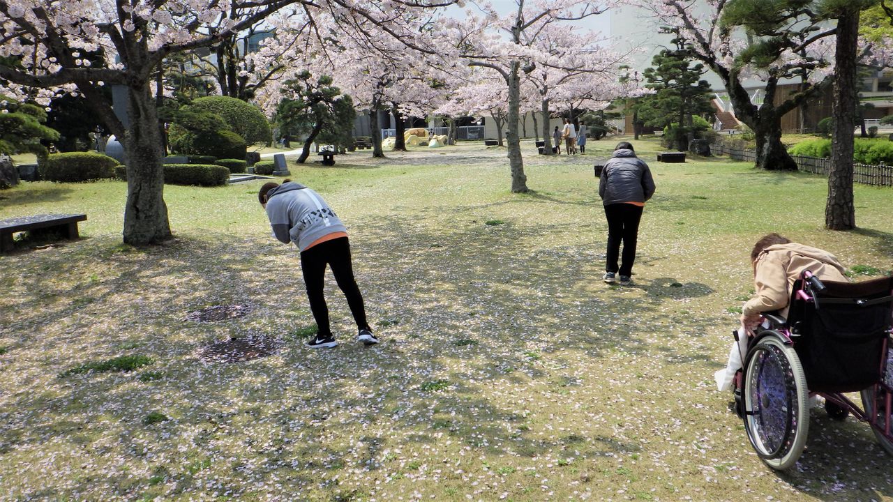 何やら、一生懸命散った桜の花びらを集めているようですが、、、