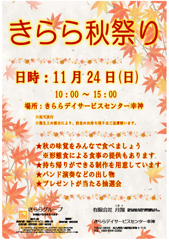 201911月6 きらら祭りのご案内 きららデイサービスセンター幸神で、初めての「きらら祭り」を開催いたします。今年のテーマは「秋がいっぱい秋祭り」とのことで、音楽あり、食事あり、制作あり、プレゼントありという事で、11月下旬ではありますが、秋を満喫するための催しを行います。日時は11月24日(日)の10:00~15:00となっております。関係者の皆様、近隣の方々、そして興味のある方々、ぜひご参加ください。