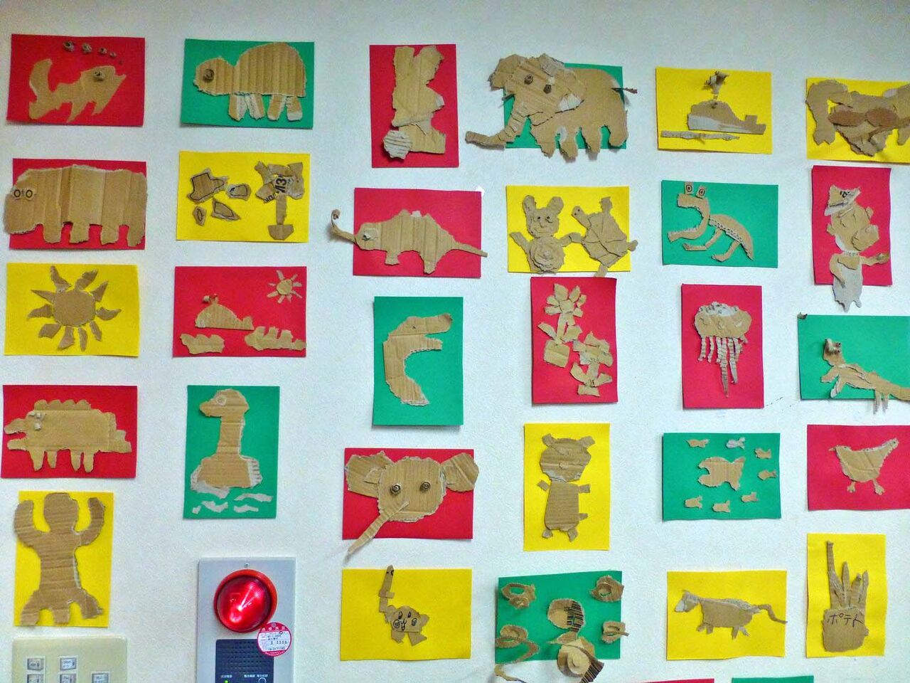 20203月13 ダンボールで動物作り(幸神生活介護) ダンボールをちぎって、様々な動物を作りましたo(゚∀゚o)それぞれどの動物か、分かるでしょうか?色画用紙に貼りつけて壁に貼ると、ちょっとアートな壁になりました(((o(゚▽゚)o)))