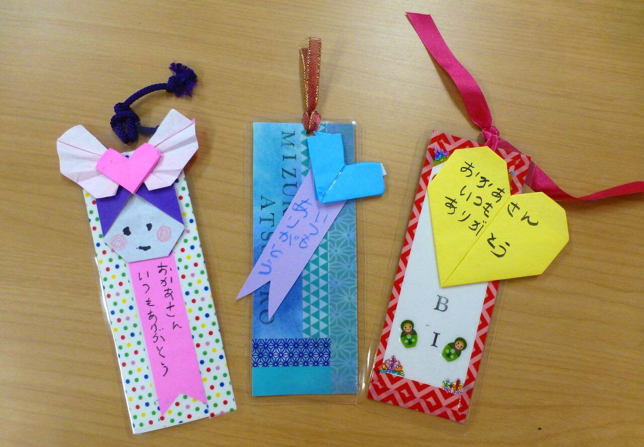20205月9 母の日の贈り物(幸神生活介護) 明日は母の日です。いつも頑張ってくれているお母さんへ、いつも愛情を注いてくれるお母さんへ、「ありがとう」を伝えたいものです。きらら幸神では、母の日の贈り物として、ハートや一言を添えたしおりを作りましたo(゚∀゚o)渡したときに、お母さんが喜んでくれる顔を想像しながら。