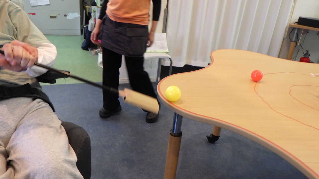 202511月12 卓上カーリング(幸神生活介護) こんにちは、きらら幸神です今回のレクリエーションは、卓上カーリングです。基本的にはカーリングと同じようなルールなのですが、ボールを打つ場所は机のどの方向からでもOKです。本物のカーリングとは違い、机上は微妙な傾斜があるのでボールがどこへ転がるかが予測不能でした…