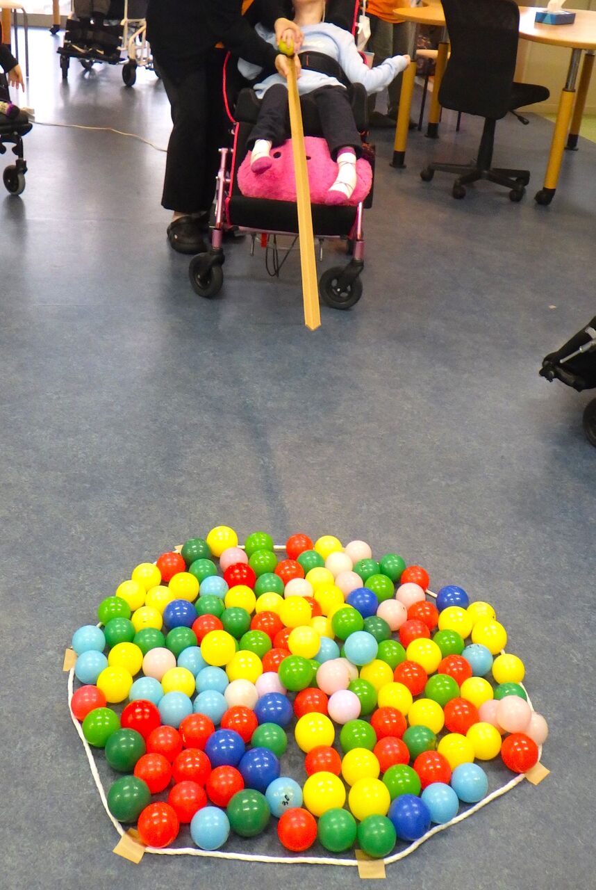 202511月5 見た目は派手ですが(幸神生活介護) こんにちは、きらら幸神です今回のレクリエーションは、ボールを何個出すかを競うゲームです。円内に敷き詰めたボールの上からテニスボールを落とし、何個のボールを円外に出せるかというものです。ただ、テニスボールだと数個しか円外にはじき出せず…次に遊ぶ時は、ボールがパーッとたくさんはじき出せるように、もっと大きなボールでやってみようと思います