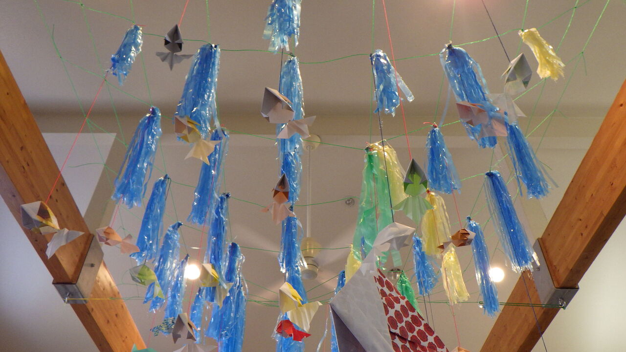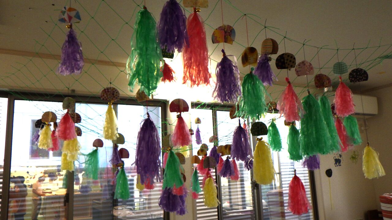 20246月26 梅雨飾り(幸神生活介護) 6月の制作では、折り紙やカラーテープを使って風鈴を作りました。また、カラーテープで梅雨の雨粒を再現しました。利用者さんと一緒にカラーテープを細かく裂いてこの雨粒をたくさん作りました(o^∇^o)このようにライトアップするとちょっと幻想的な雰囲気になります(*゚∀゚)っ晴れ間が恋しい季節です(TДT) 「幸神」カテゴリの最新記事